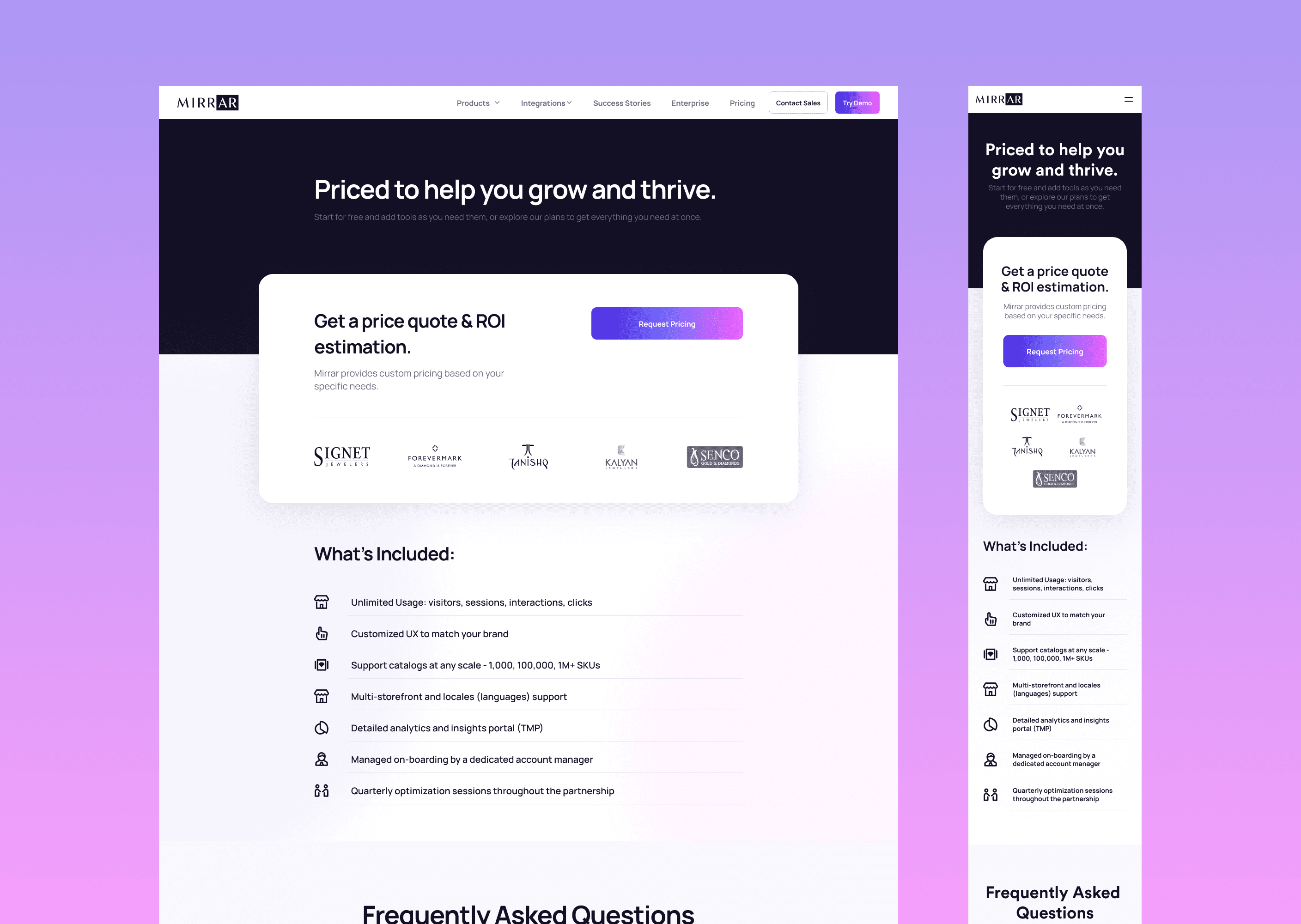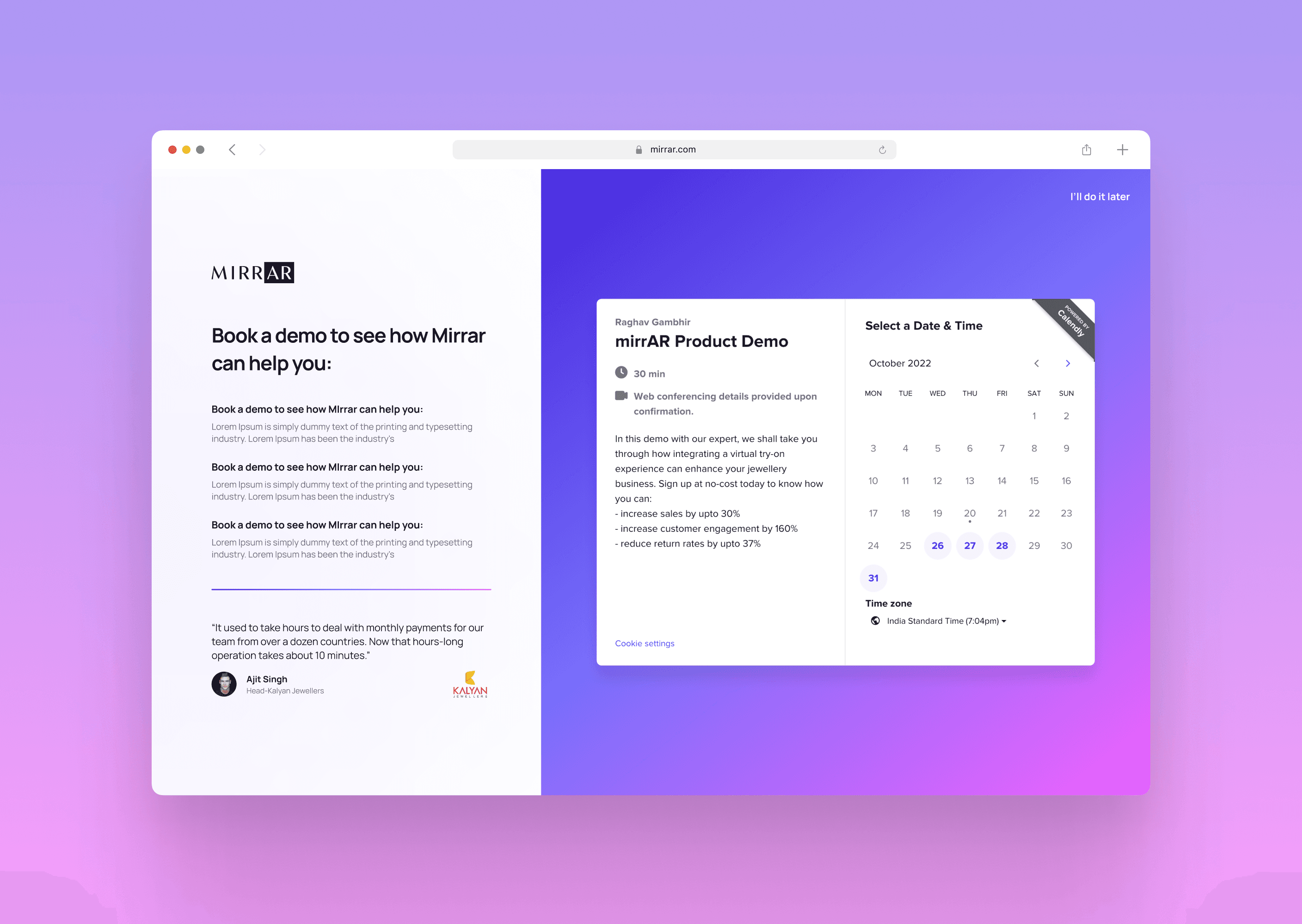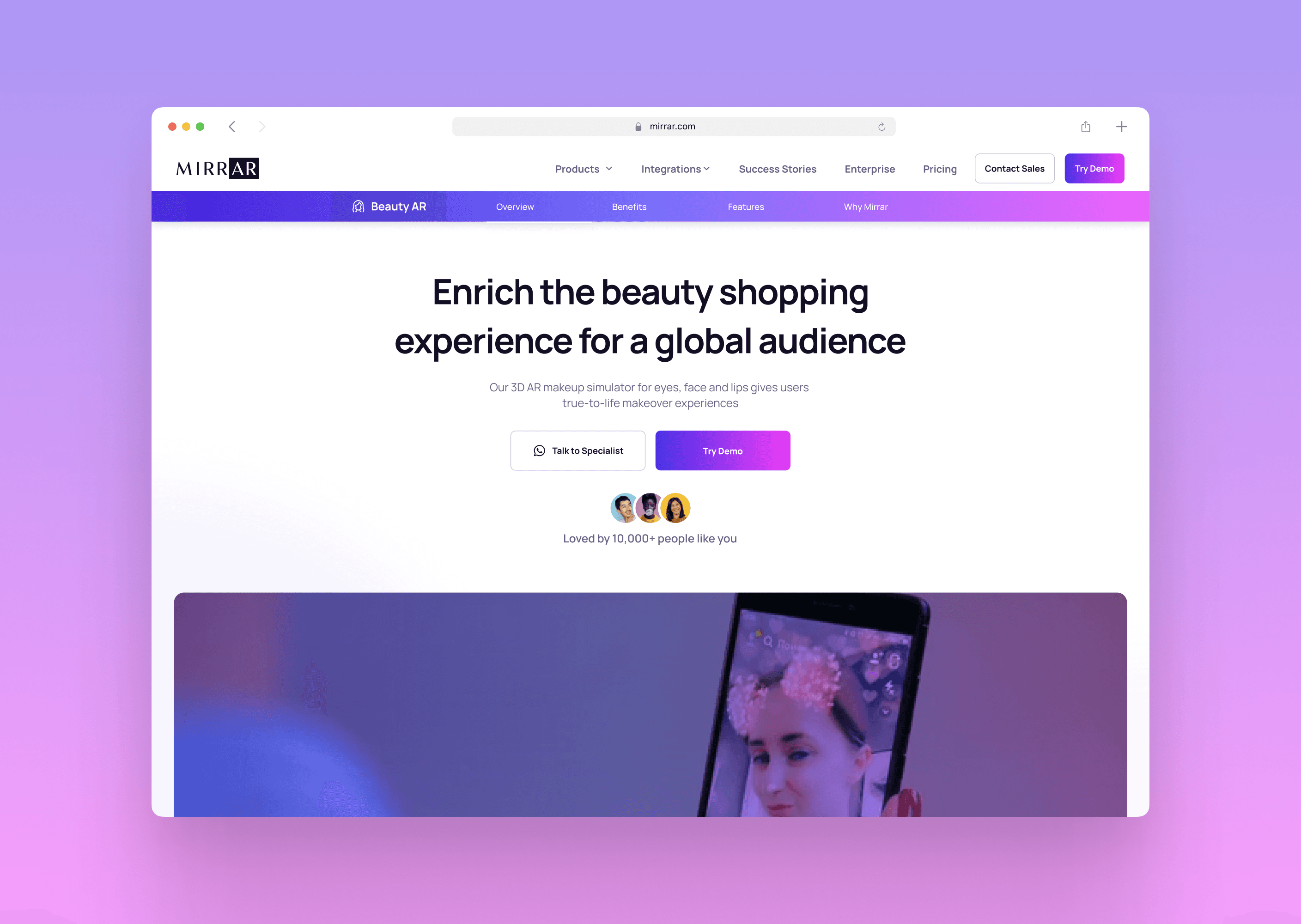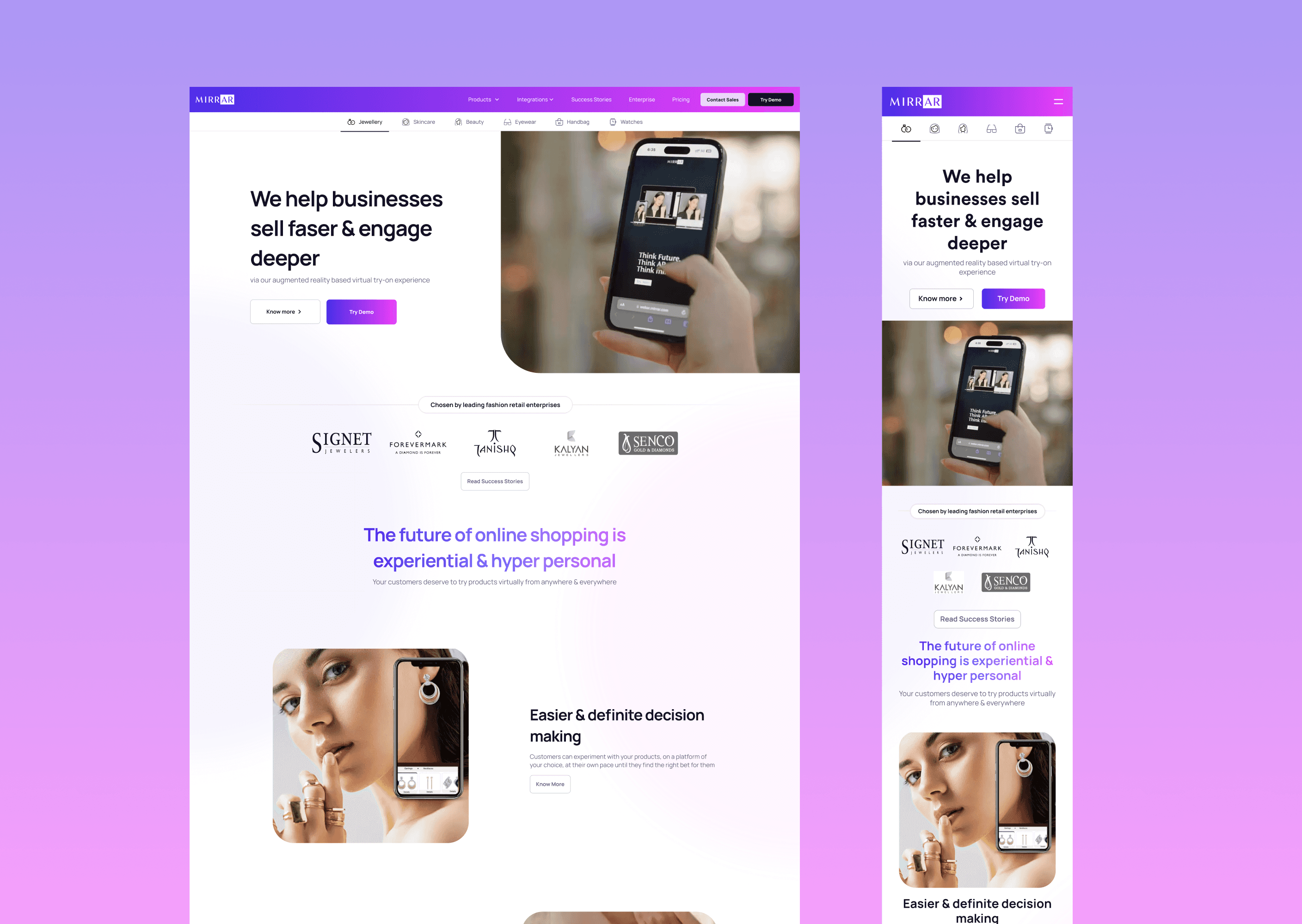 mirrAR provides augmented reality (AR) solutions for virtual try-ons, enhancing online shopping for products like jewelry and beauty items. Their platform boosts customer engagement and reduces return rates.